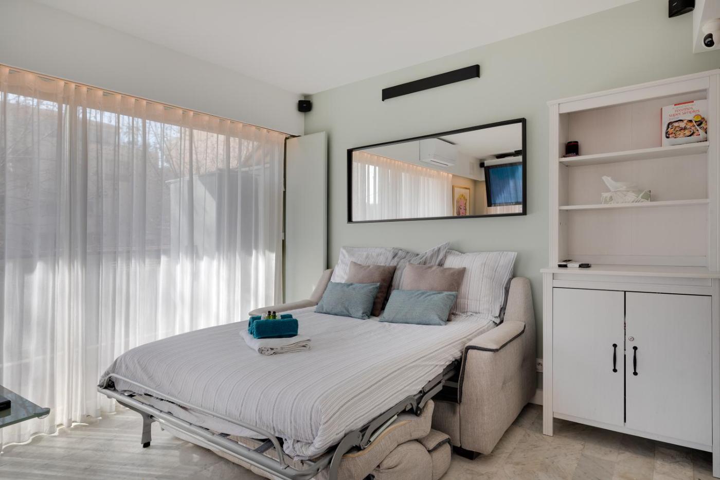 One-Bedroom Apartment. This air-conditioned apartment comprises 1 living room, 1 separate bedroom and 1 bathroom with a shower. The well-equipped kitchen features a dishwasher, an oven and a microwave. The apartment provides a washing machine, a tea and coffee maker, tumble dryer, a dressing room, as well as a flat-screen TV. The unit offers 2 beds.