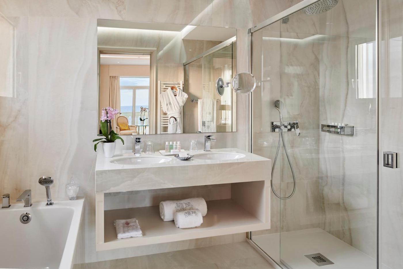 Deluxe Room. Offering free toiletries and bathrobes, this double room includes a private bathroom with a walk-in shower, a bath and a hairdryer. The spacious air-conditioned double room offers a flat-screen TV with streaming services, soundproof walls, a minibar, a tea and coffee maker as well as sea views.