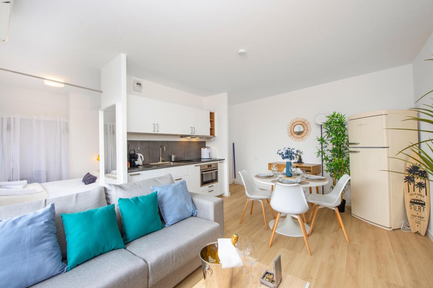 One-Bedroom Apartment. This apartment comes with 1 living room, 1 separate bedroom and 1 bathroom with a shower and free toiletries. The fully equipped kitchen has a stovetop, a refrigerator, kitchenware and an oven. The air-conditioned apartment features a flat-screen TV with streaming services, a washing machine, soundproof walls, a tea and coffee maker as well as sea views. The unit has 2 beds.
