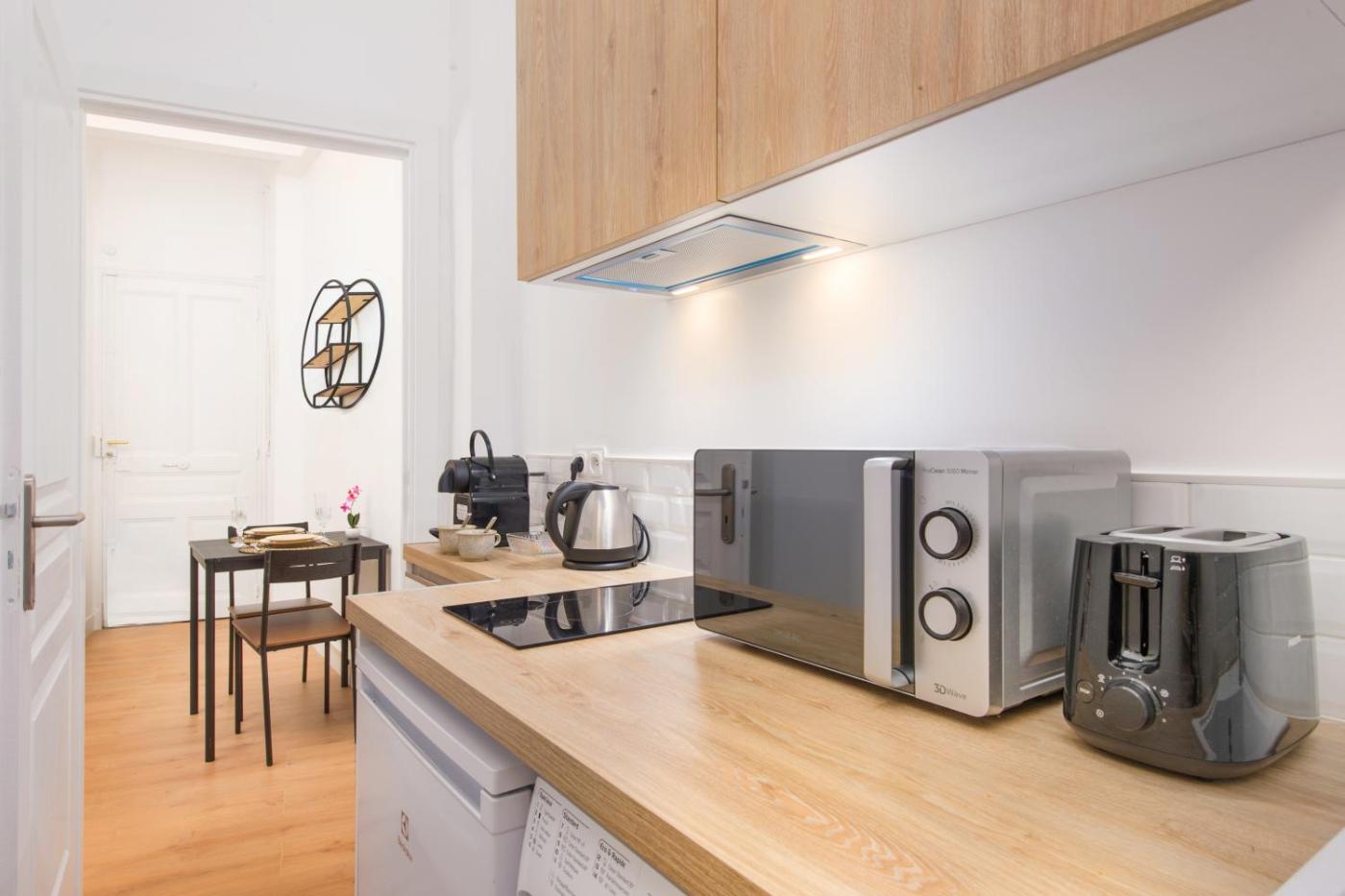 One-Bedroom Apartment. The air-conditioned apartment features 1 bedroom and 1 bathroom with a shower and a hairdryer. Guests can make meals in the kitchen that is fitted with a stovetop, a refrigerator, kitchenware and a microwave. The apartment has parquet floors, a seating area with a flat-screen TV with satellite channels, a washing machine, soundproof walls, as well as a tea and coffee maker. The unit offers 1 bed.