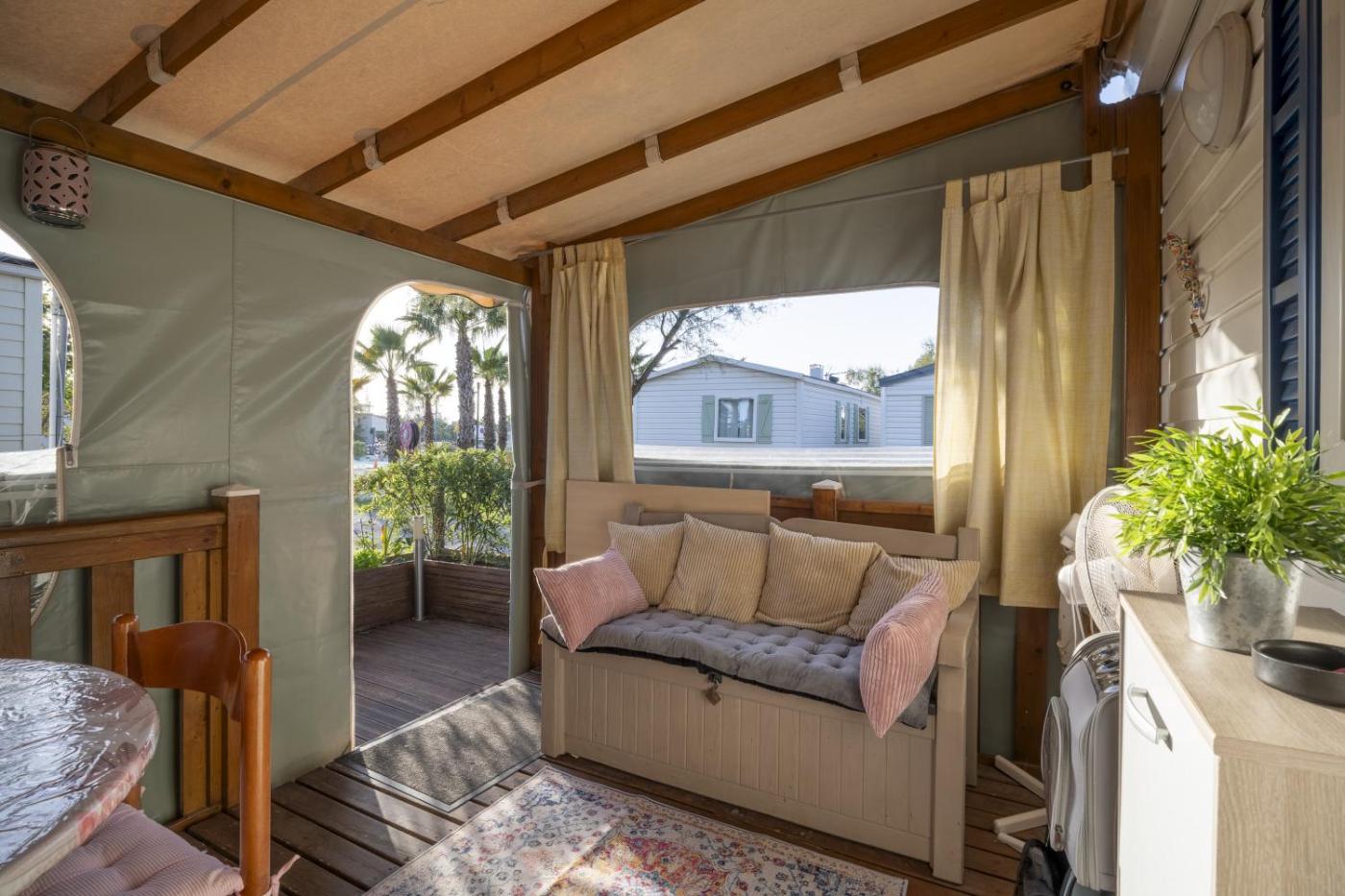 Mobile Home. Featuring a private entrance, this air-conditioned mobile home is comprised of a kitchen, 2 bedrooms and 1 bathroom with a shower and a hairdryer. Guests will find a dishwasher, kitchenware, an oven and a microwave in the well-fitted kitchen. The mobile home also has a barbecue. Boasting a terrace, this mobile home also offers a washing machine, a coffee machine and a TV with cable channels. The unit offers 3 beds.