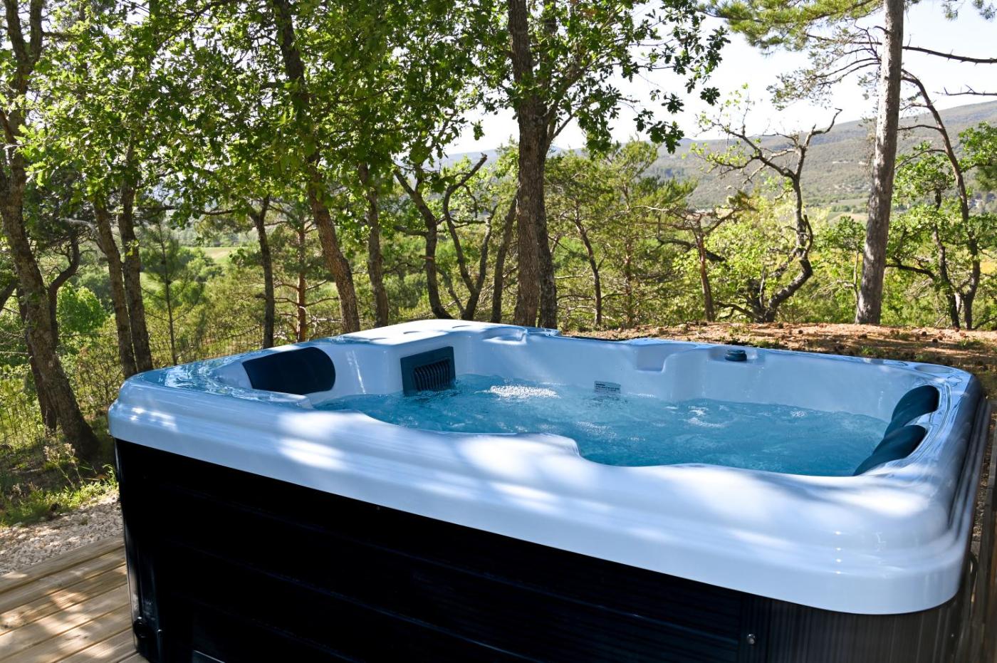 Mobile Home. Guests will have a special experience as this mobile home provides a hot tub. This air-conditioned mobile home includes 1 living room, 2 separate bedrooms and 1 bathroom with a shower. The well-equipped kitchen has a stovetop, a refrigerator, kitchenware and a microwave. Boasting a terrace with garden views, this mobile home also offers a coffee machine and a flat-screen TV. The unit has 4 beds.