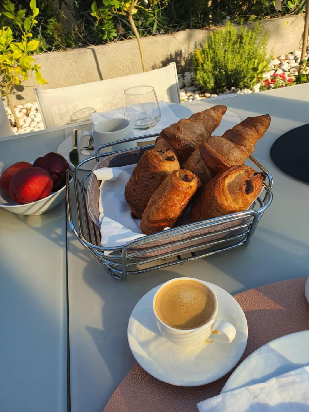 A selection of options including fresh pastries, fruits and juice is served for the continental breakfast.