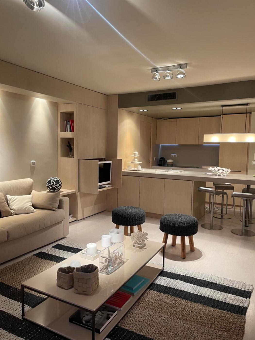 One-Bedroom Apartment. This air-conditioned apartment comes with 1 living room, 1 separate bedroom and 1 bathroom with a shower. The well-fitted kitchen has a stovetop, a refrigerator, a dishwasher and kitchenware. Boasting a balcony, this apartment also features a washing machine, a coffee machine and a flat-screen TV. The unit has 2 beds.