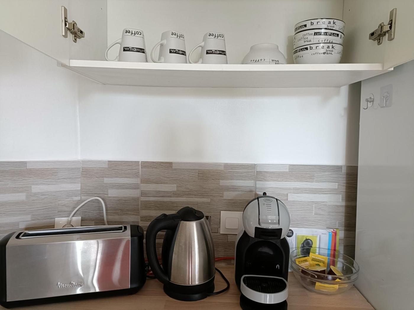 One-Bedroom Apartment. This apartment comprises 1 living room, 1 separate bedroom and 1 bathroom with a shower and free toiletries. Meals can be prepared in the well-fitted kitchen, which comes with a stovetop, a refrigerator, kitchenware and an oven. The apartment provides a washing machine, a tea and coffee maker, a dining area, a flat-screen TV with satellite channels, as well as garden views. The unit offers 3 beds.
