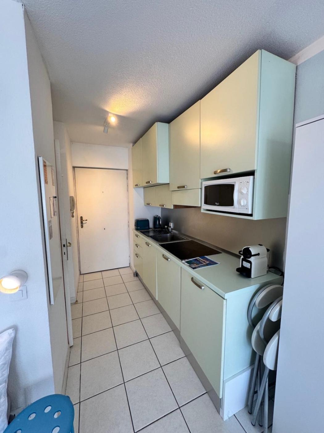 Offering mountain views, Studio front de mer - Accès direct plage - Parking is an accommodation located in Villeneuve-Loubet, 12 km from Allianz Riviera Stadium and 12 km from Russian Orthodox Cathedral. This beachfront property offers access to a balcony and free private parking. The property is non-smoking and is100 metres from Plage des Bouches du Loup.